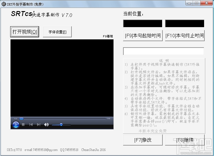 SRTcsj字幕制作用于视频字幕制作(外挂字幕srt)。随时添加、修改字幕。自动保存。程序较小,无需安装,点击即可运行。使用方便、简洁。保存的srt文件名称与视频名称相同,且放在同一文件夹下。
