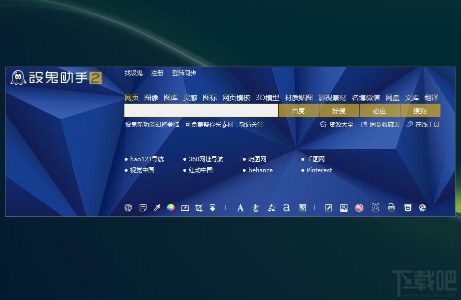 设鬼助手整合了设计师常用的各类小工具及在线工具,同时收集了相当丰富的设计素材、灵感资源,独创的搜索功能专为设计工作者量身设计,使用“设鬼助手”,将能大大提升设计师的工作效率及产生更多的灵感创意,让刚入门的设计师或资深设计师更快速有效地找到创意、灵感及素材,是设计师人手必备的工具软件之一。有了这个工具,设计师将不再需要到处寻找各种常工具资源,因为一个500多KB的设鬼助手已经帮设计师罗列好。