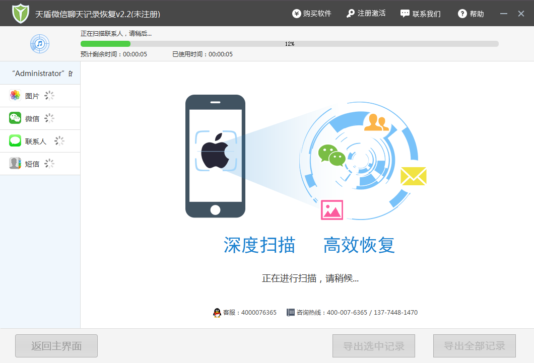 3、天盾微信聊天记录恢复软件会开始备份手机数据。数据成功备份后,即可开始扫描iPhone设备中的记录。