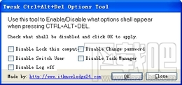 相信有一点电脑基础的朋友都会说Ctrl+Alt+Del =windows任务管理器,其实这道题目的答案可以用一个小工具来改写,这就是自定义Ctrl+Alt+Del 界面小工具,按下 Ctrl+Alt+Del 后,一般的屏幕会显示出很多选项,比如锁定电脑、更改用户、注销、修改密码、启动任务管理器等等。如果你需要屏蔽掉其中的某一项甚至全部屏蔽掉的话,就可以使用 Editctald了。
