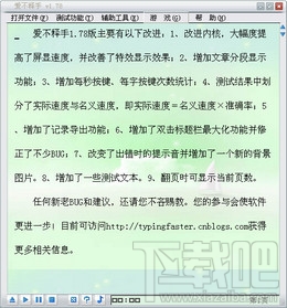 一个打字练习,测试,学习的综合环境。主要特点:可以使用任何文本文件,网页文件进行练习和测试。无论英语,汉语还是其它语言的混合文本都可练习。词组提示:对于五笔86、98版,任意汉语文本实现词组及编码提示,同时支持全拼、双拼等其它输入法的编码提示。编码反查功能。从剪贴板直接粘贴功能。音乐播放功能:mp3,mid多曲循环播放。此外,她的测试结果详尽:除了普通的速度,准确率外,利用软件提供的指法检测功能可以得到您对每个字符的平均反应时间及易错字符等信息,据此进行更有针对性的练习。界面精美大方并可实现换肤。新增易错字收集等功能,相信她众多的功能定会让您”爱不释手“。