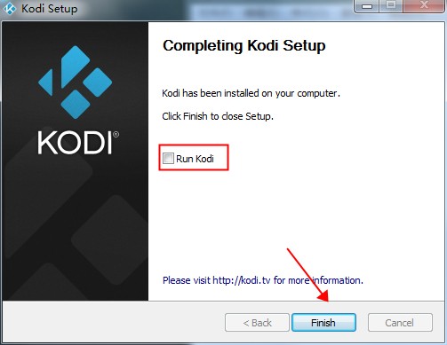 8、安装完成,勾上"Run Kodi"后单击Finish退出安装向导立即运行,反之。