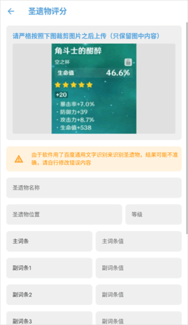 3、例如圣遗物评分,你可以上传截图也可以手动输入圣遗物的信息;