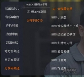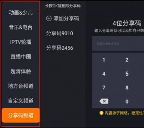 第二步:接着用遥控器往下按一直按到底,就可以看到分享码频道了,然后在右边输入4位数字的分享码,就可以把这个频道添加到节目内容里了。有了分享码,海量的电视频道想看就看,还是很方便的。