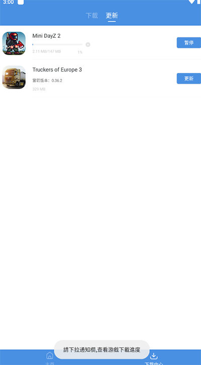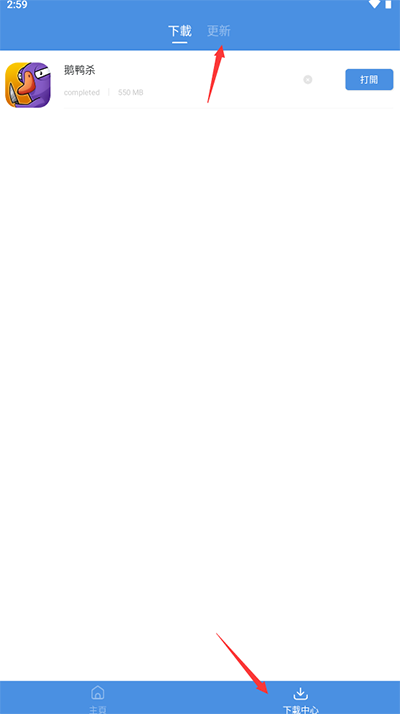 1、先打开gamestoday软件以后,进入软件内部点击下方箭头所指的【下载中心】,上方会有更新按钮点击。