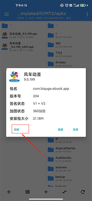3、点击apk文件,在弹出的选项中,选择【功能】。