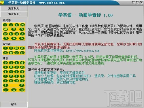 通过系列动画教学全面掌握英语音标。利用它,您可以从英语音标的发音规则、重音规则到元音、辅音的发音识读等系列动画教学中,掌握英语音标的全部内容,从而为您进一步使用配套的《潜移默化学英语》打下良好的基础。
