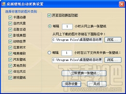 想让您对桌面背景每天都保持新鲜感吗?那就用这款 “桌面壁纸天天换” 软件吧。您可以设置时间间隔,它会每隔一段时间从网上自动下载精美雅致的壁纸,并把它设为桌面背景。您可以设置图片类别,它会投您所好,让您天天享受视觉盛宴,保持美丽心情。
