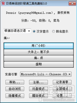 日语单词进阶背诵工具是一个用来背单词的工具软件,它是一个绿色软件,解压后可以直接运行执行文件。该工具简洁实用。它采用类似GRE机考的模式,出题让用户选择正确答案。开始出现的单词为难度低的单词,答对后用户的分数逐渐增长, 单词的难度也增加。对于初学者,软件总是出容易的题; 而对于水平高的人,单词难度逐渐增加。因此能适合各种日语水平的用户。而且, 一个单词本身的难度是动态调整的, 单词答对了, 该单词本身的难度就降低, 单词答错了, 该单词本身的难度就上升。