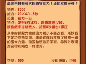 特点:发射6枚冰豆,反伤减速1/帧,反伤概率冻结敌人,抵御8次锤击/碾压