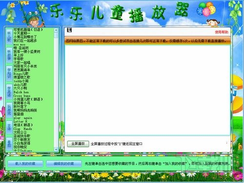 乐乐儿童播放器收录了1000多首儿歌、500多个儿童故事,2000多个儿童游戏,以及涉及拼音、汉字笔画、成语、绕口令、三字经、弟子规、手工制作、语文课件、数学课件、物理课件、动物科学、植物科学、生物科学、幼儿教育等4000多个学知识的FLASH,还有1000个学英语的FLASH,700多首古诗朗诵,300多个看图识字,所有动画都有专业人员的录音,文字颜色随录音的播放而变色。所有文字加有拼音,并能区分多音字。特色功能还有2000多个动画识字,可以按照笔画顺序写出汉字。对您孩子的早期教育一定会有非常大的帮助,让您的孩子赢在起跑线上。乐乐儿童播放器并且是款免费绿色软件,无任何插件,解压即可运行。