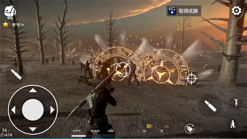 2、进入游戏后通过虚拟摇杆进行移动,划动屏幕进行瞄准,点击射击键发起攻击;