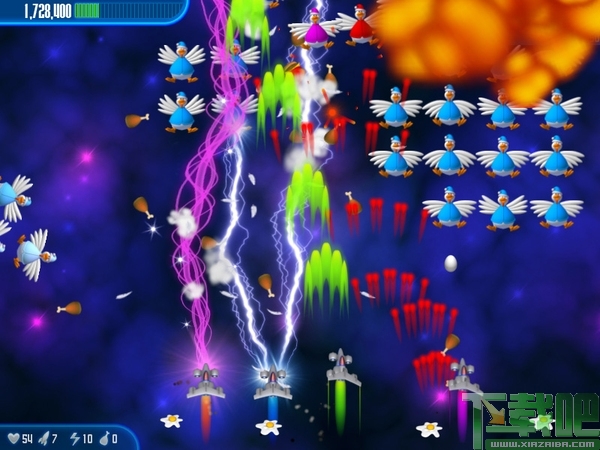 小鸡入侵者3蛋黄的复仇是一款有趣的射击游戏,玩家将驾驶超级战机与许多的怪鸡对抗。游戏有点类似小蜜蜂的射击游戏,只能左右移动,而无法做上下移动。与小蜜蜂不同的是,本游戏敌人出现的位置变化较多。游戏可一人独乐,也可以两人一起同乐,一起为保卫地球努力。游戏进行当中,除了与怪鸡作战之外,还要躲避众多陨石的攻击。这些陨石掉落速度很快,而且数量众多,一时并无法全部清除,所以如何有效躲避是本游戏的一个重要技巧。在猎杀怪鸡的时候,有时会有"天上掉下来的礼物",玩家接到礼物之后,武力将可以增强,更有效率地对抗敌人。