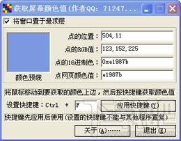 屏幕颜色拾取器将您能在屏幕上看到的颜色转换成我们使用的数据颜色(网页颜色或者是R,G,B颜色),让您尽情的享用你喜欢的颜色。这个软件是免费的,解压后直接运行即可。