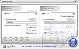 Apollo DVD Copy是一款强大的DVD复制工具,用于把你的收藏的DVD复制到DVD-R/RW或DVD+R/RW盘片上,该工具很容易使用,使用了简洁的界面,没有复杂的参数设置。支持NTSC/PAL制式。