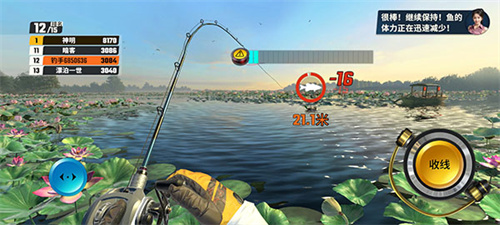 4、在完成抛竿后等待鱼上钩,同时通过收线消耗鱼的体力;