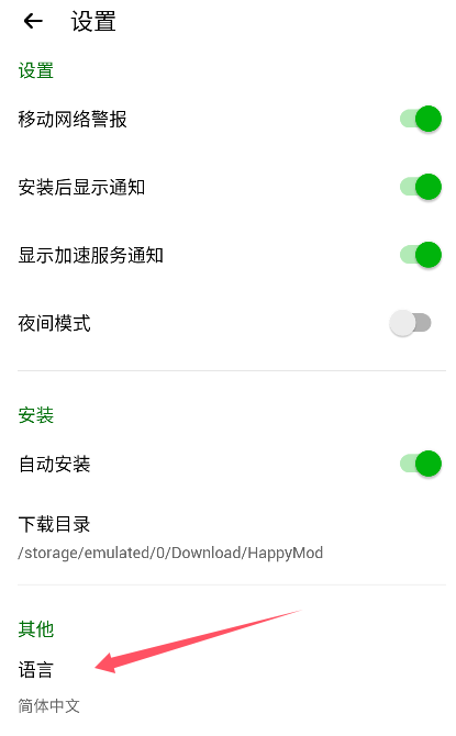3、在设置页面的【其他】可以看到语言功能,点击进入语言切换页面。