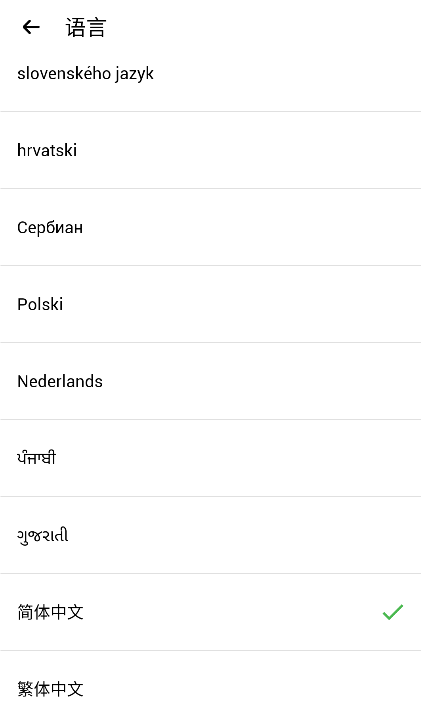 4、最后进入语言页面往下滑,在最底部可以找到【简体中文】,勾选后就能设置成中文。