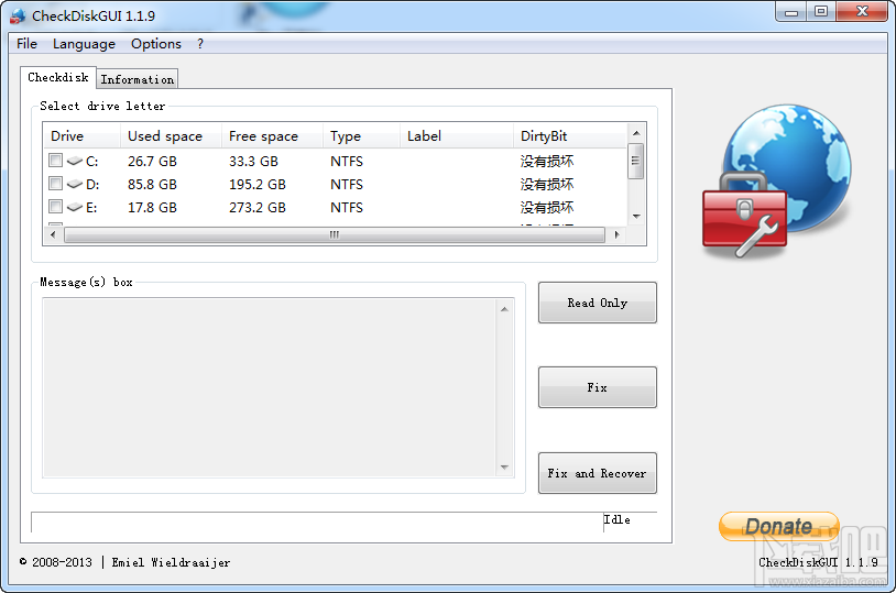 CheckDiskGUI硬盘检测工具是命令行版chkdsk.exe的图形界面版,界面已经汉化为中文。chkdsk.exe可以检测并修复磁盘分区的错误。