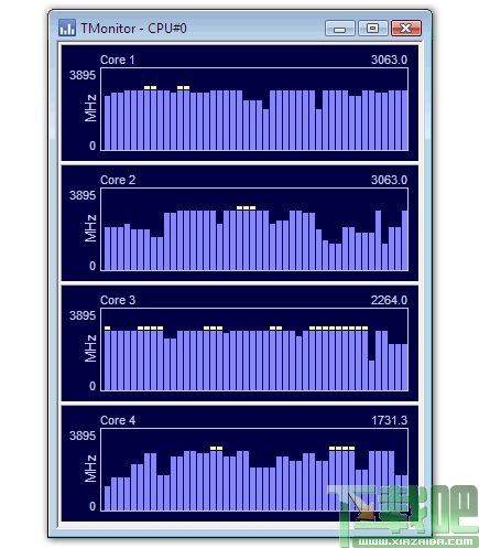 TMonitor的界面比较简单,大小仅仅为500多KB,TMonitor通过柱状图显示CPU每个核心的实时频率变化(刷新频率为每秒20次)。另外,可支持Turbo Boost技术的CPU,提升频率数据则以黄色表示。软件界面还能够切换为实时显示CPU的倍频变化情况。