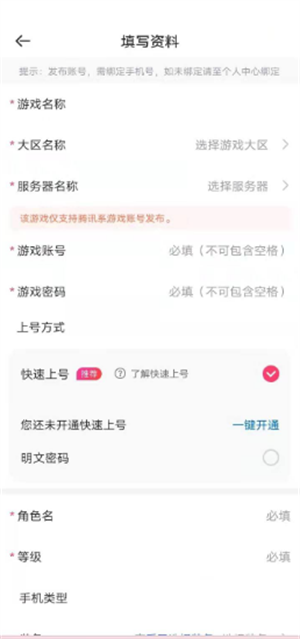 4、直接输入该游戏大区,角色,等级等游戏信息。