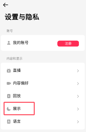3、在设置页面找到下图的【展示】,点击进入。