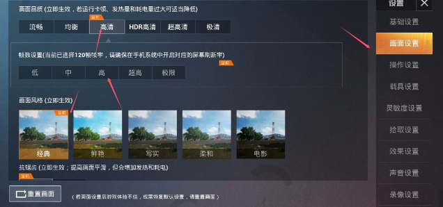 4.设备自带90帧,需将画质调高一个挡位,才可以解锁120/240FPS。如设备自带均衡90帧率,需要将画质调整为高清,方可生效。