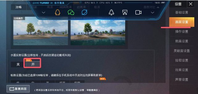 3、往下滑,找到水面反射设置,点击开启,会解锁120帧FPS画质。