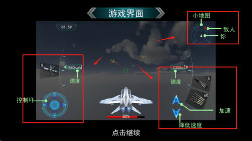 4、使用左下角的控制杆来控制飞机的飞行方向。使用右下角的加速和减速按钮来控制飞机的速度。通过右上角的小地图了解你和敌人的位置。