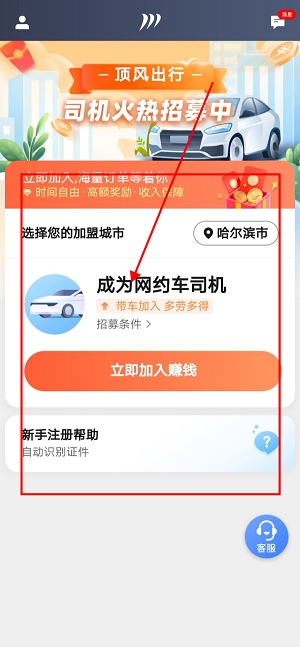 1、打开顶风出行app,点击“立即加入赚钱”。