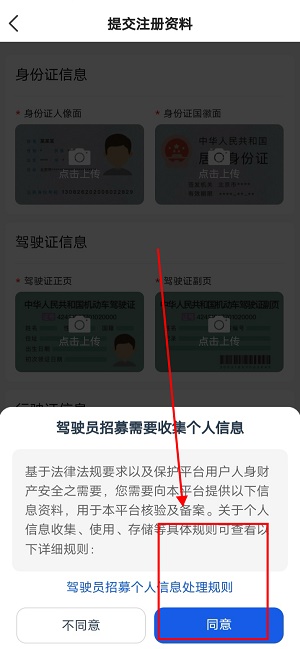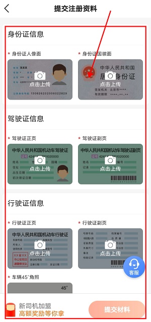 3、输入身份证、驾驶证等信息点击“提交材料”,审核通过就可以加入赚钱了。