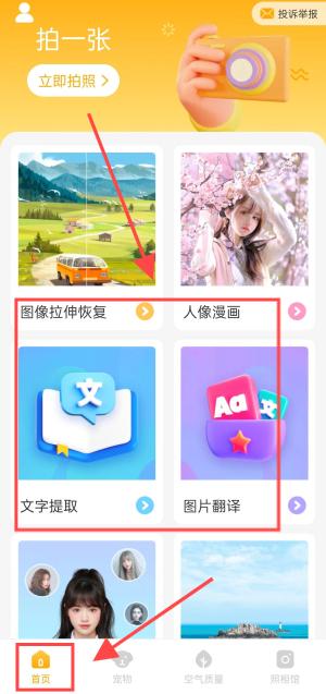1、打开软件后,首页有图像拉伸恢复和人像漫画等功能。