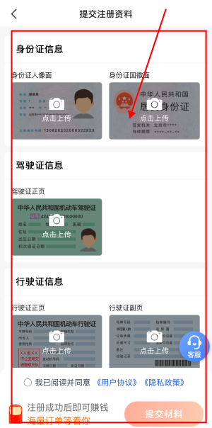 3、输入身份证、驾驶证等信息点击“提交材料”,审核通过就可以加入赚钱了。