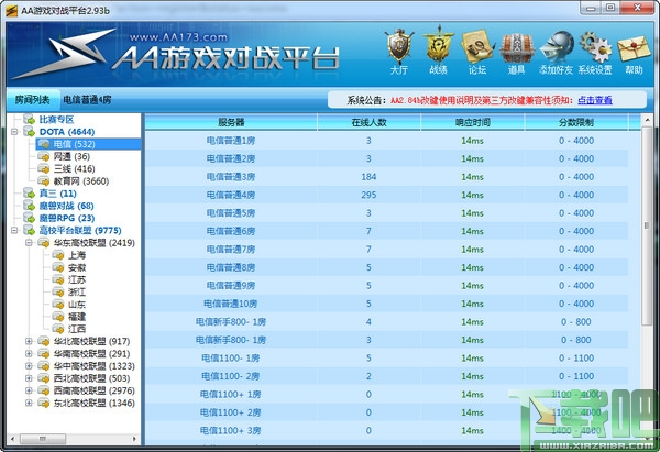 AA游戏对战平台是由复旦大学学生自己开发的魔兽争霸专属对战平台,支持高校内用校园内网进行游戏。目前对玩家的常用英雄、胜率、总杀敌数,在本校和整个平台的排名有统计。