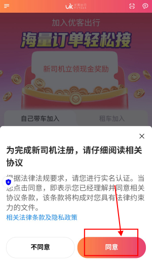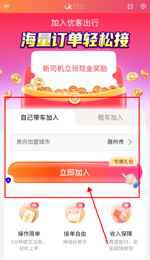 1、打开优客出行app,选择加入方式点击“立即加入”。
