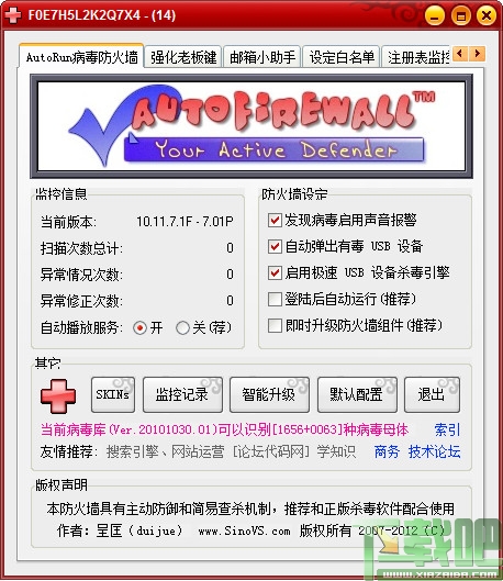AutoRun病毒防火墙(AutoFireWall)是一款集AutoRun病毒防火墙、强化老板键和邮箱小助手等功能于一体的多功能桌面工具,防火墙可以实时的监控您电脑上的AutoRun病毒,实时拦截插入的USB设备并对其进行检测,如果发现有AutoRun病毒,则会启动杀毒引擎进行查杀和修复,进而自动弹出USB设备,正常情况下,再次插入USB设备即可正常使用。同时,作为一款优秀的桌面工具,防火墙同时集成了通过鼠标(或键盘)隐藏桌面窗口、检测邮箱是否有新邮件到达并及时通知,等扩展功能。