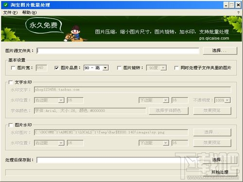 主要功能:图片压缩,缩小图片尺寸,图片旋转,图片加文字或图片水印,支持批量处理。支持处理的图片格式:png,jpg,gif,bmp,tbi。图片经过处理后,减少对空间的占用,也就节省了图片空间费用。这是一款绿色软件,下载后解压缩到电脑上的一个文件夹里就能使用,无需安装。