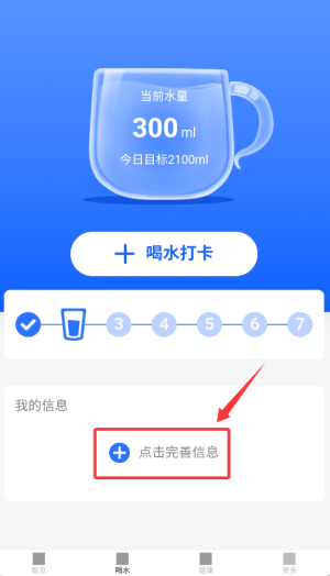 3、习惯管理:进入喝水打卡界面,点击记录每次饮水量,查看每日完成进度。