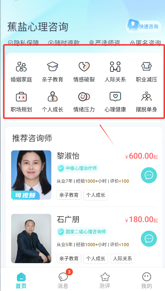 2、咨询师团队覆盖多个心理学流派,包括认知行为疗法,人本主义疗法等,满足不同用户的个性化需求。