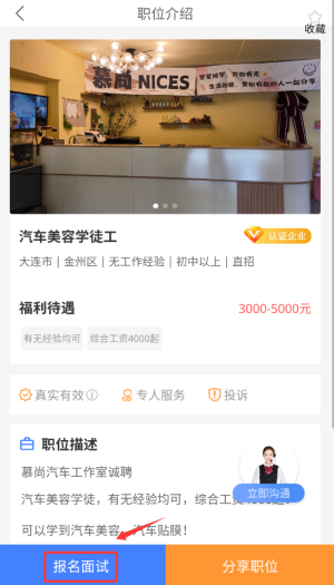 2、浏览职位详情后,点击"报名面试"按钮提交个人简历资料。