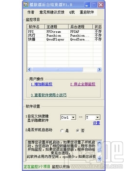 现在的播放器尤其是网络播放器,大部分都是带有p2p后台传输程序的,当您关闭播放器的时候,后台程序往往是没有关闭的。这就导致了,在之后的游戏或是网页浏览时,感觉网速过慢。那么解决的方法就是关闭后台程序。但是,用户必须有一定的电脑常识和判断能力。如果您结束了一个正常的系统进程,那么您的电脑运行会不稳定,甚至会重启。编写了这个小软件,可以在启动本软件后,自动判断有哪些播放器在运行(**请您先添加)。然后,如果检测到播放器的前台退出后,软件会在3.0秒钟后结束后台进程,从而省去了您亲自找相关后台进程的烦恼。