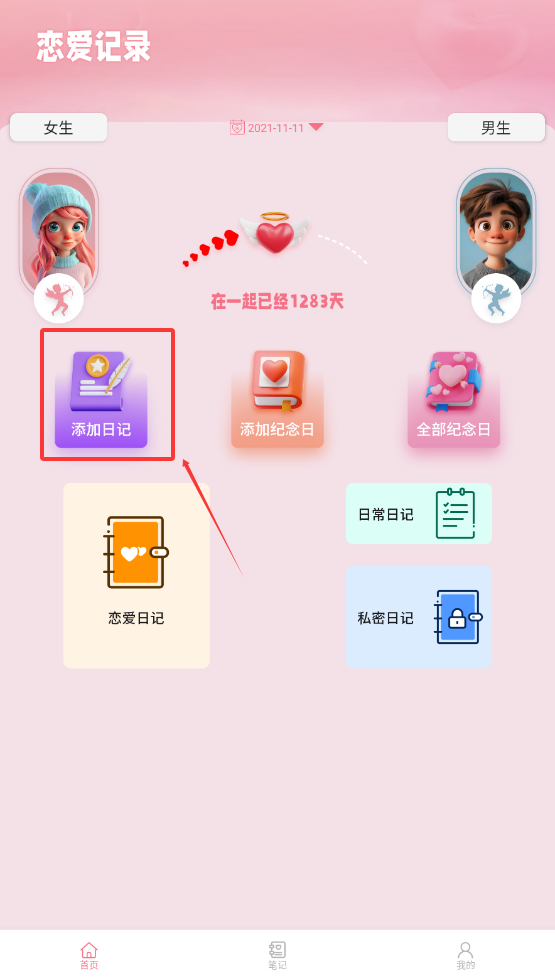 3、进入笔记本后,可以添加每天的点滴日记,方便后期回忆双方的恋爱日记。