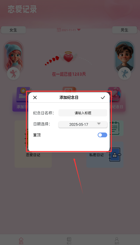 2、点击添加在一起的日期,方便日记填写后记录双方的甜蜜时光。