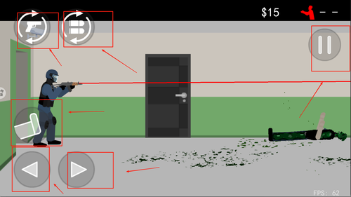 3、玩家需要移动到有敌人的地方,需要移动右边屏幕瞄准敌人射击开火。