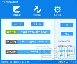 行云海定时关机助手是一款小巧实用的免费关机|闹钟|提示工具软件。集成了定时/延时/空闲 打开(程序/网站/文件)、关机、重启、注销、锁定屏幕、关闭显示器、休眠和挂机功能。集成桌面时钟(win8风格),语音报时,闹钟提醒功能。也可立即执行任务(右击托盘菜单处)。体积小,占用资源小。