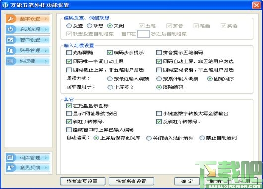 2.新增多项个人习惯设置,可选择/取消。包括万能键、分号模式、一级简码调频、Ctrl+空格等。