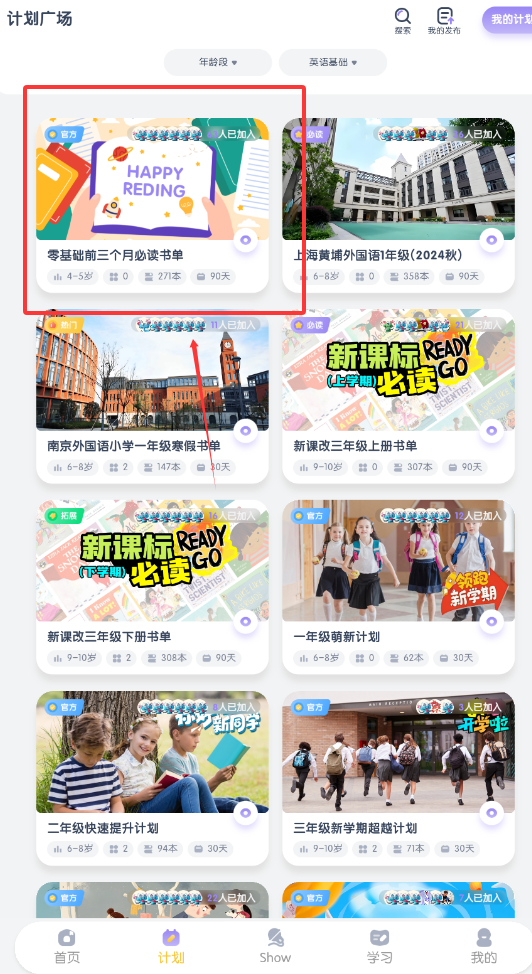 2、进入计划广场,可以选择以下,往下翻阅选到自己喜欢的加入计划内,即可使用。