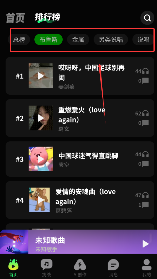 3、进入排行榜,选项内选择喜欢的类别歌曲,往下翻阅,即可收听。