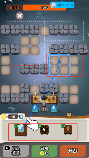 1、开始游戏后选择关卡进入战斗画面,根据僵尸类型调整防御塔位置与道士技能。