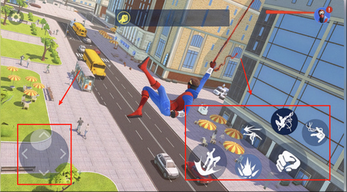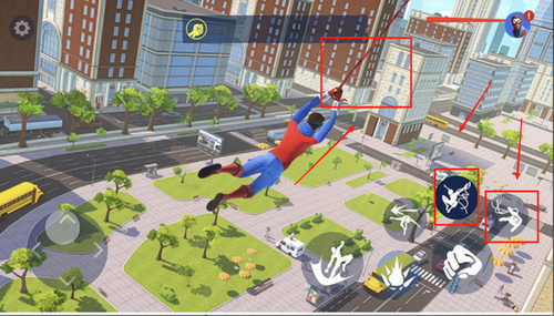 1、开始游戏后选择关卡或自由模式进入城市地图,利用虚拟摇杆控制角色移动,点击技能按钮发射蛛丝进行飞荡或攻击。